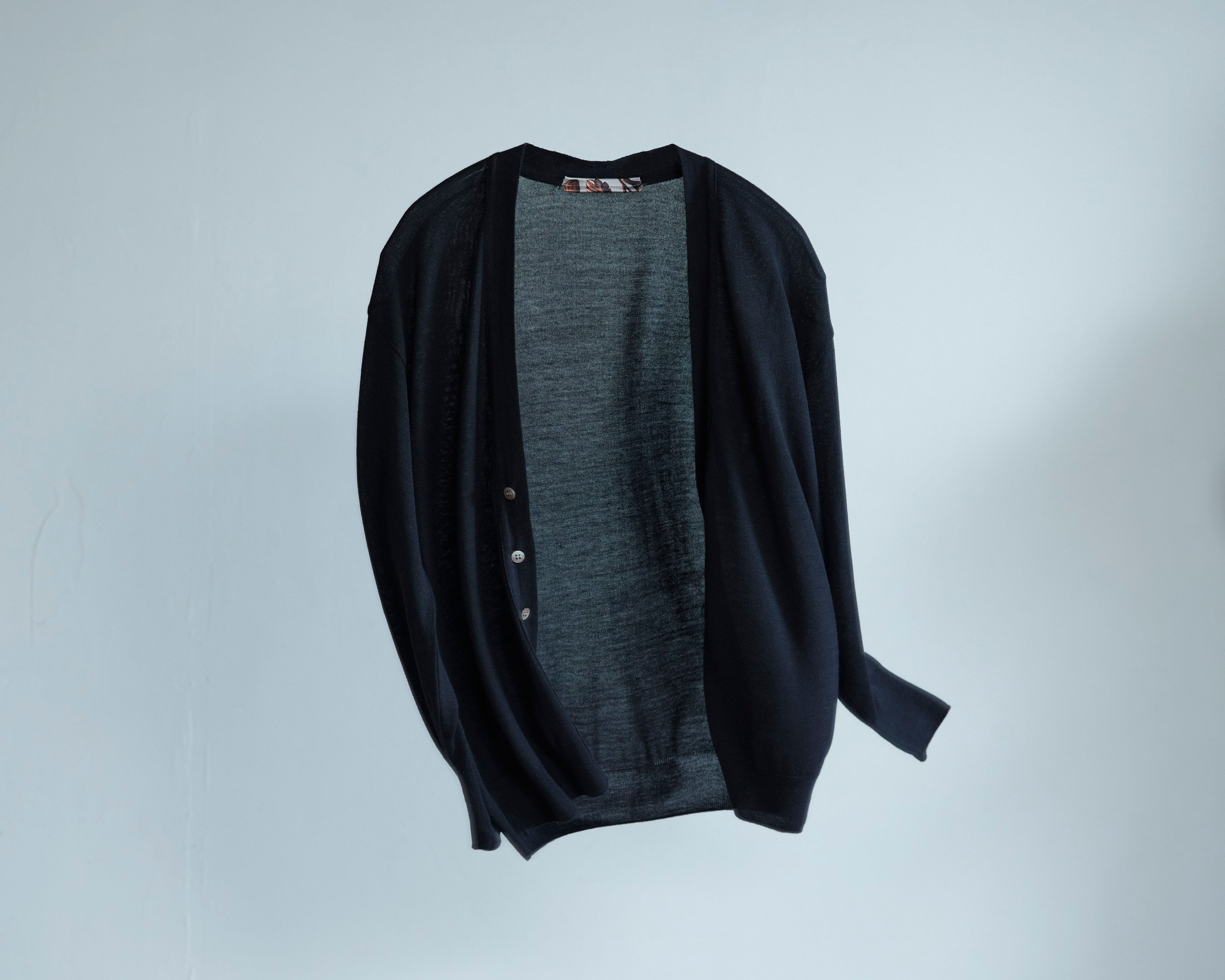 その重さ、約125グラムの薄く軽く温かいシルク100%の糸で編み上げたシルクカーディガンは3色ございます。『青藍』『臙脂色』『濡羽色』この3色とおサイズも3つからお選びください。
