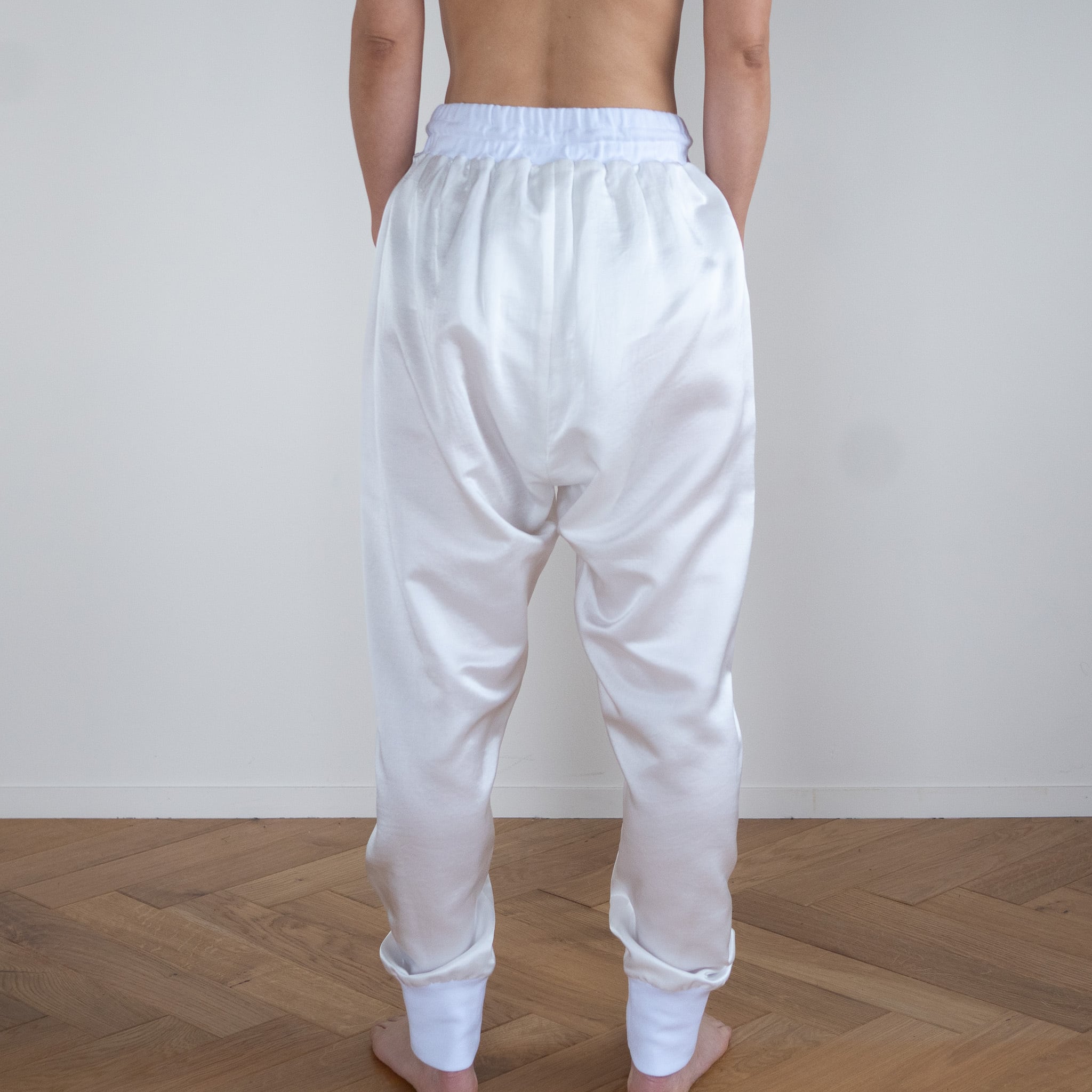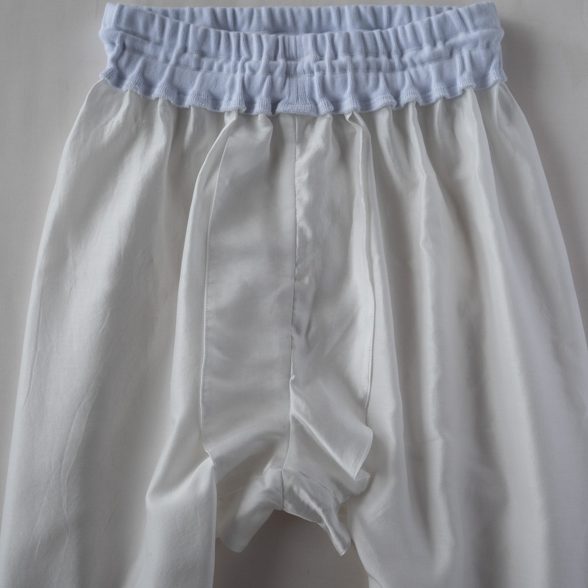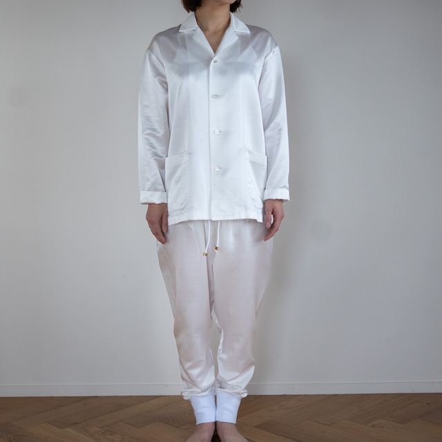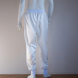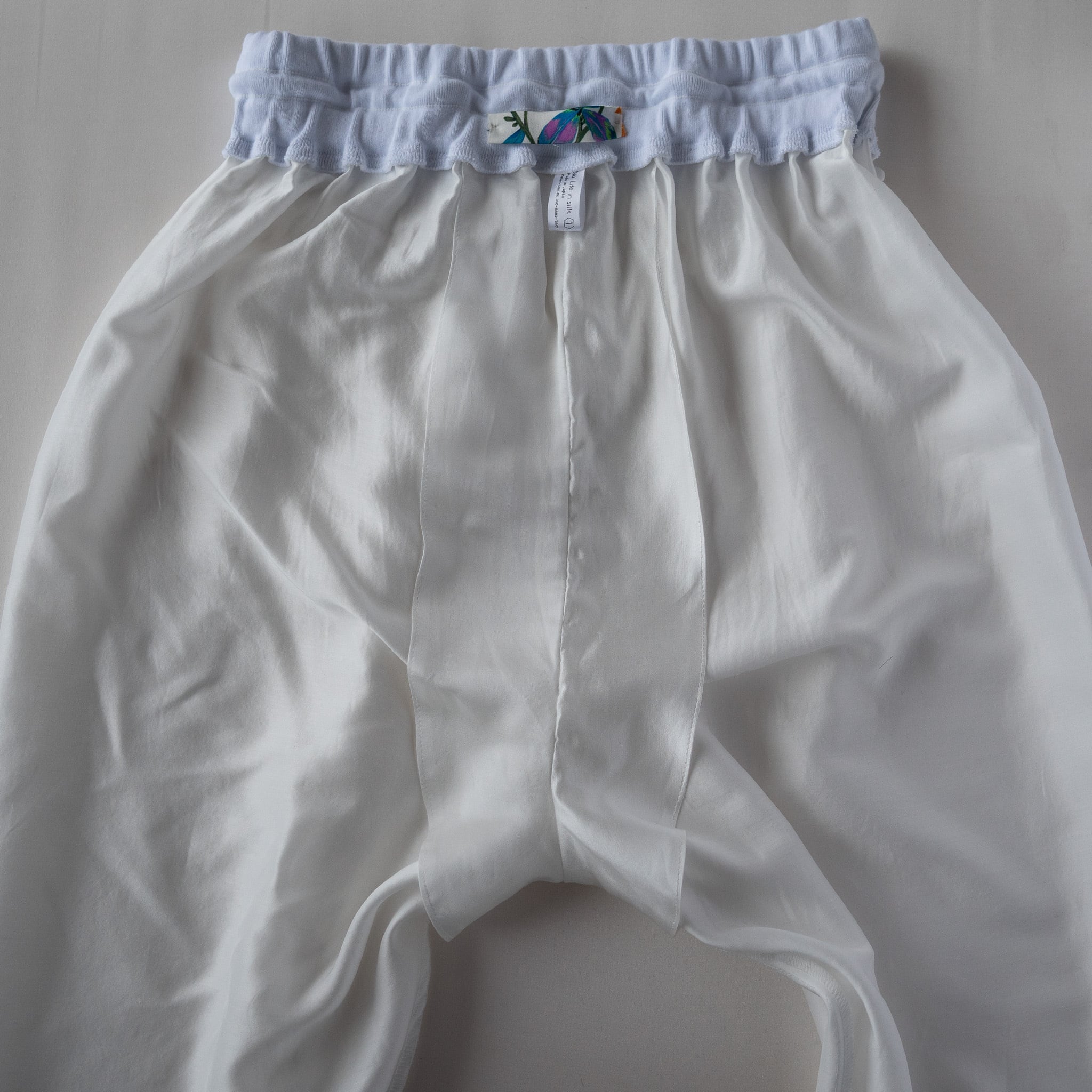 まずサルエルパンツが最高にキュート!女性でも男性でも最高の着用感をご用意しました。パンツの素材はシルク37%、コットン63%の18匁のサテン織。軽く、しなやかでゆったりとしたシルエットでとにかく動きやすいのが特徴です。裏にコットンが優位に出る織り方なので裏返してネットに入れていただけば洗濯機でも洗っていただけるイージーケア。腰と裾のリブ生地も最高級のコットンリブを使用。伸びがあり着脱も簡単に脱ぎ着できます。