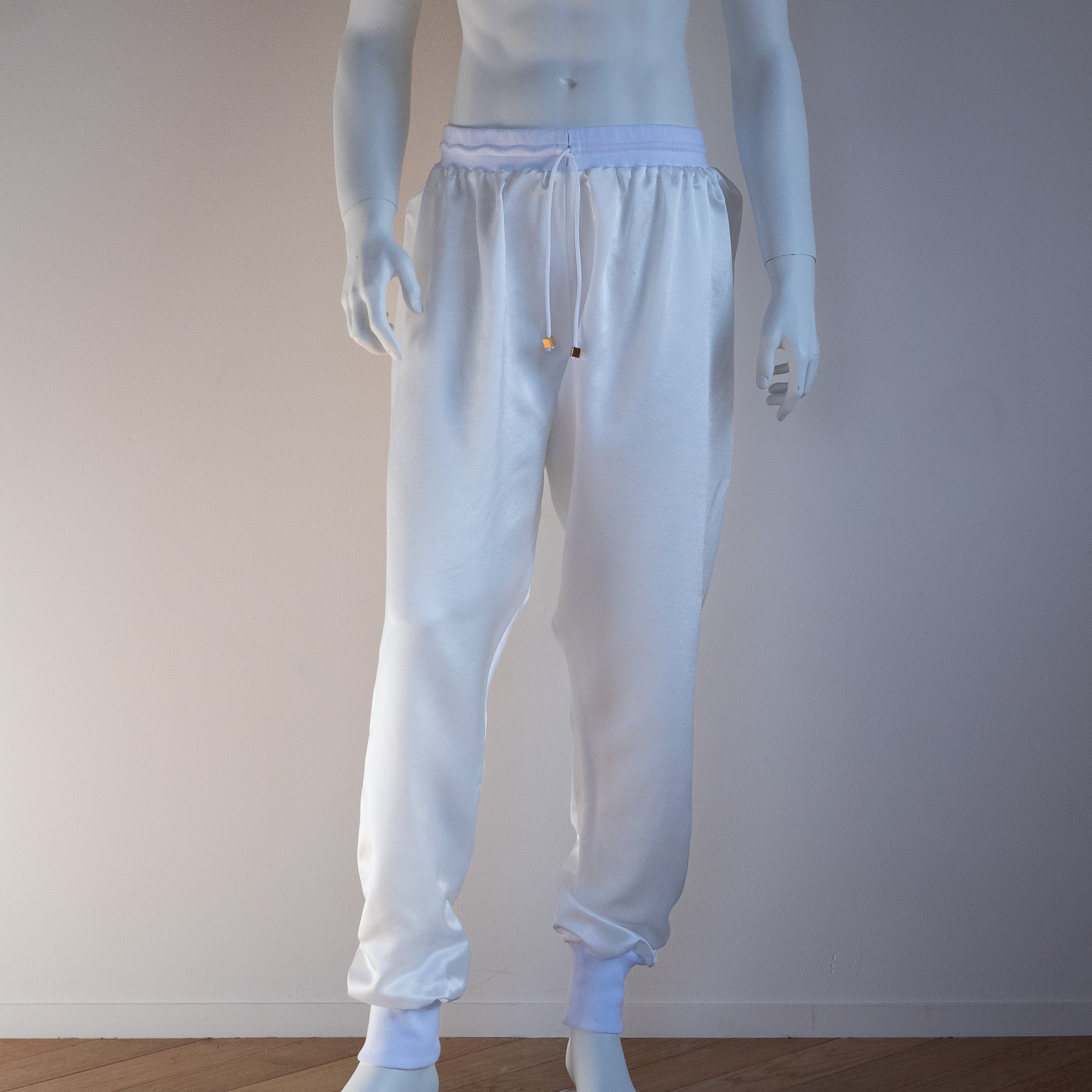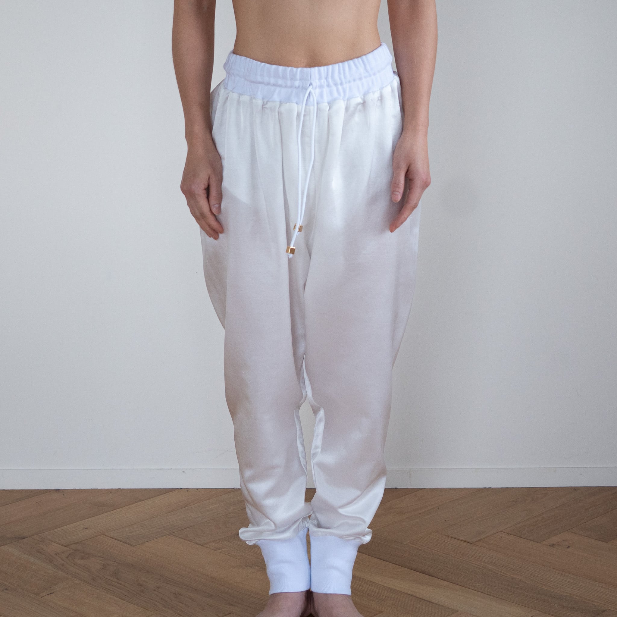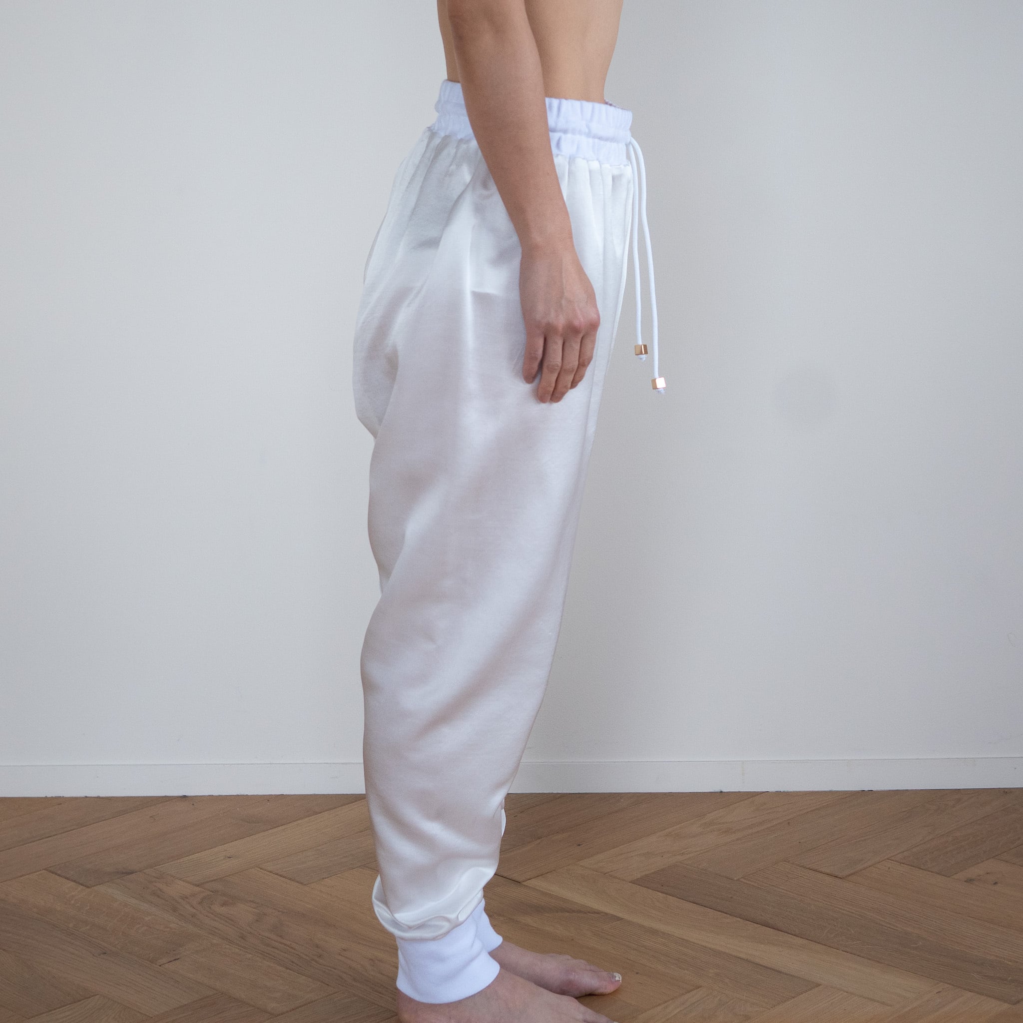 まずサルエルパンツが最高にキュート!女性でも男性でも最高の着用感をご用意しました。パンツの素材はシルク37%、コットン63%の18匁のサテン織。軽く、しなやかでゆったりとしたシルエットでとにかく動きやすいのが特徴です。裏にコットンが優位に出る織り方なので裏返してネットに入れていただけば洗濯機でも洗っていただけるイージーケア。腰と裾のリブ生地も最高級のコットンリブを使用。伸びがあり着脱も簡単に脱ぎ着できます。