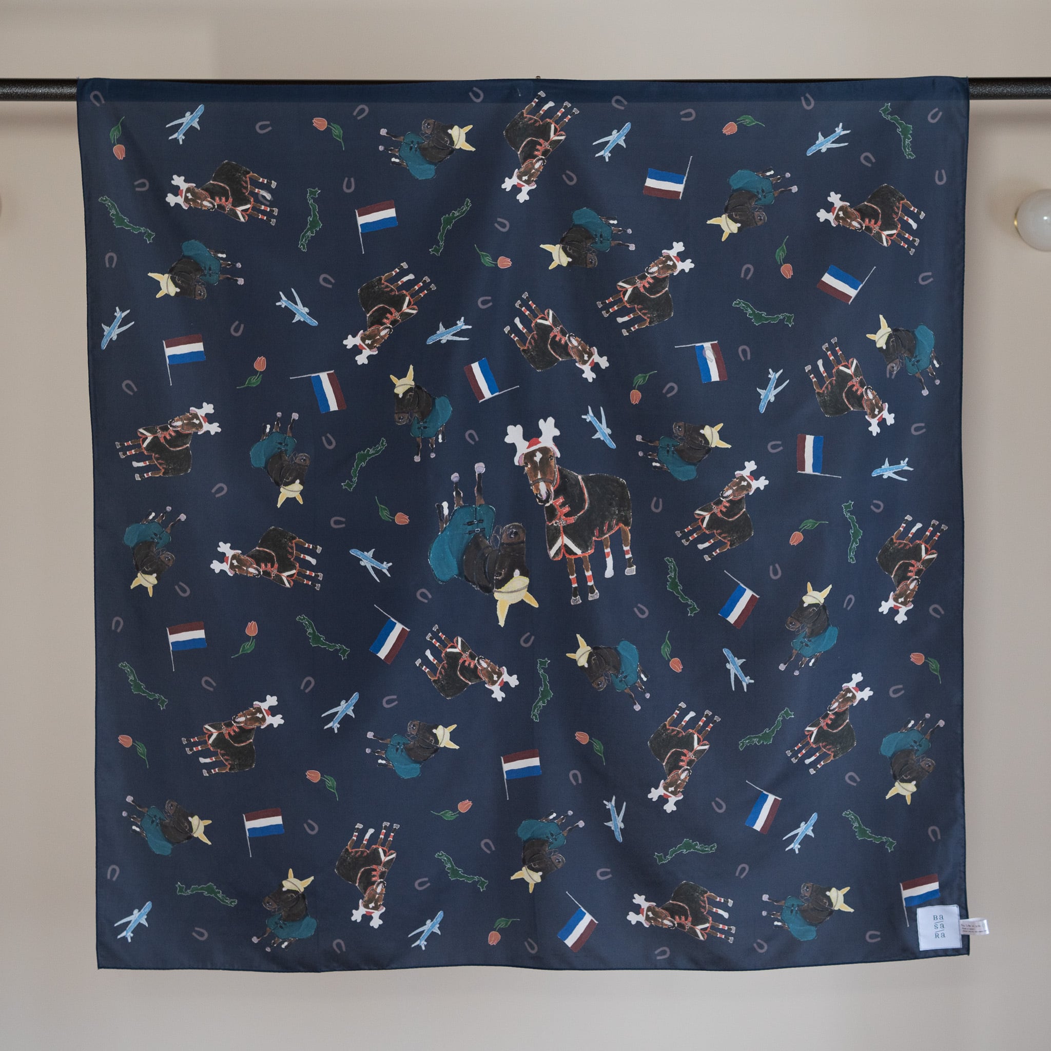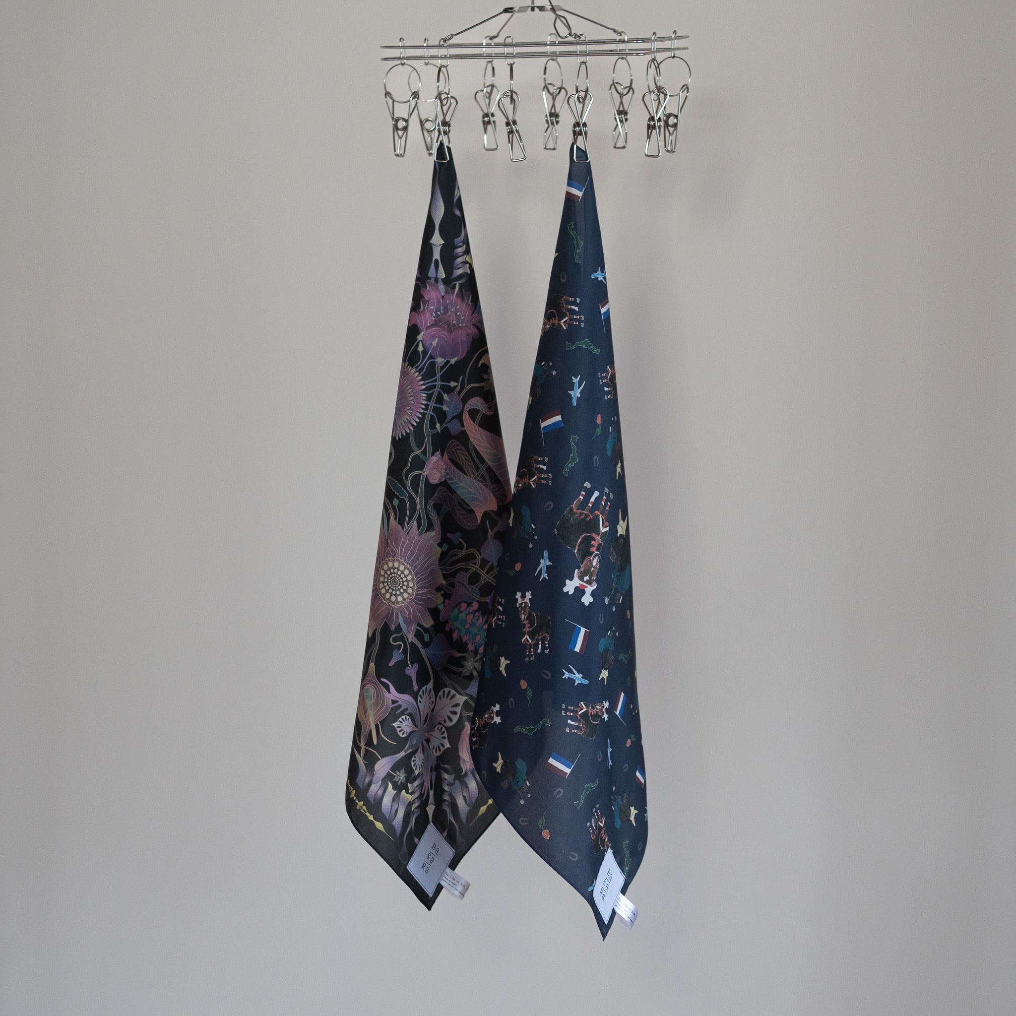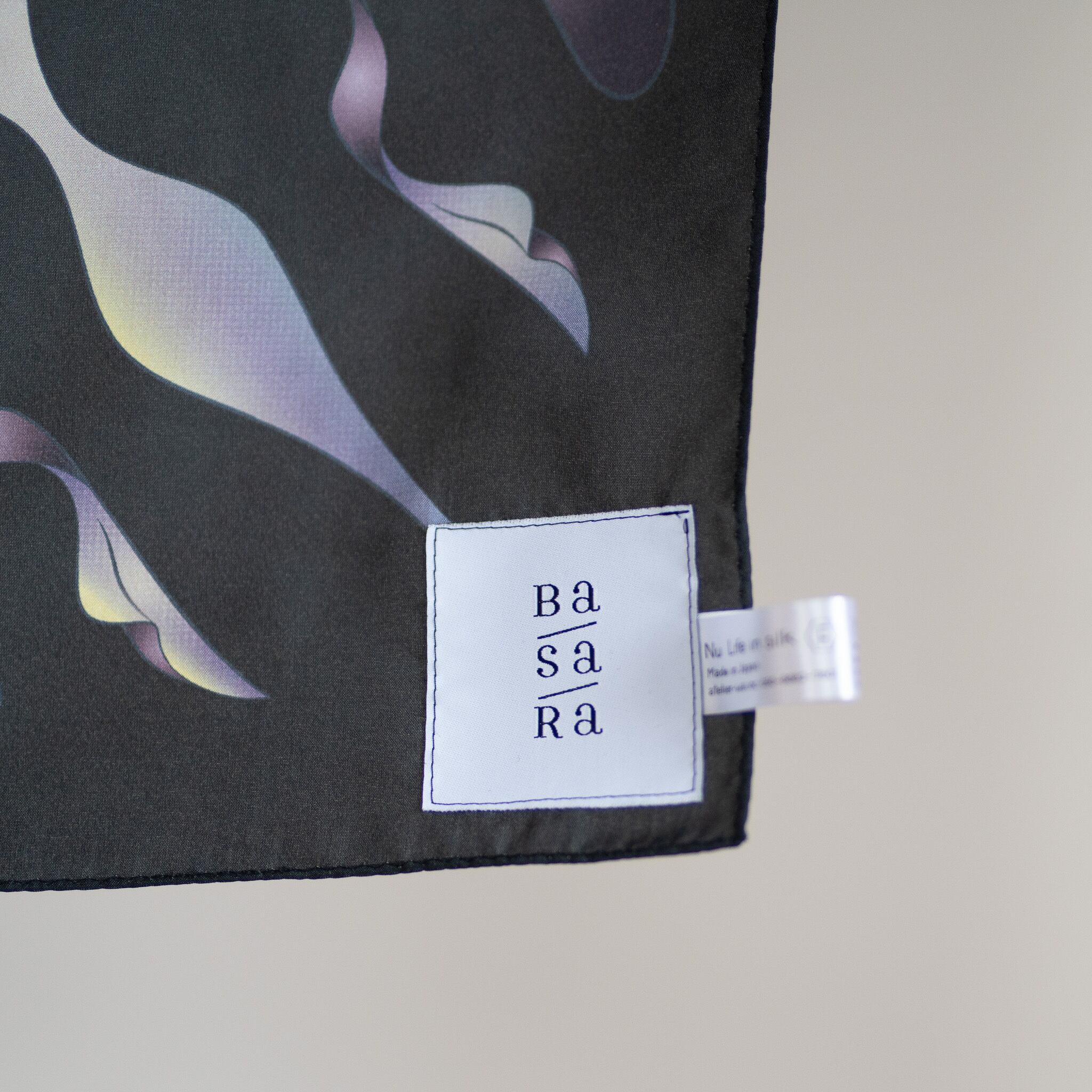 この世にありそうで実在しない花や木々が空間の中で咲き乱れ、絡まり合い、美しい色彩で共鳴し合う、"Space Flower"。こちらは一つずつ原案から生み出したBasaraオリジナルデザインです。もう一つは、メイクアップアーティストShihomiによる絵本、"ぼくたちはふたご"の原画から生まれた馬たちへの愛情と願いが込められたデザインの"Sachimo"。馬も絹も古来よりずっと人間のパートナーとして共存してきました。敬い、大切に共存していくパートナーとして馬たちへの愛情と願いを込めたスカーフです。
