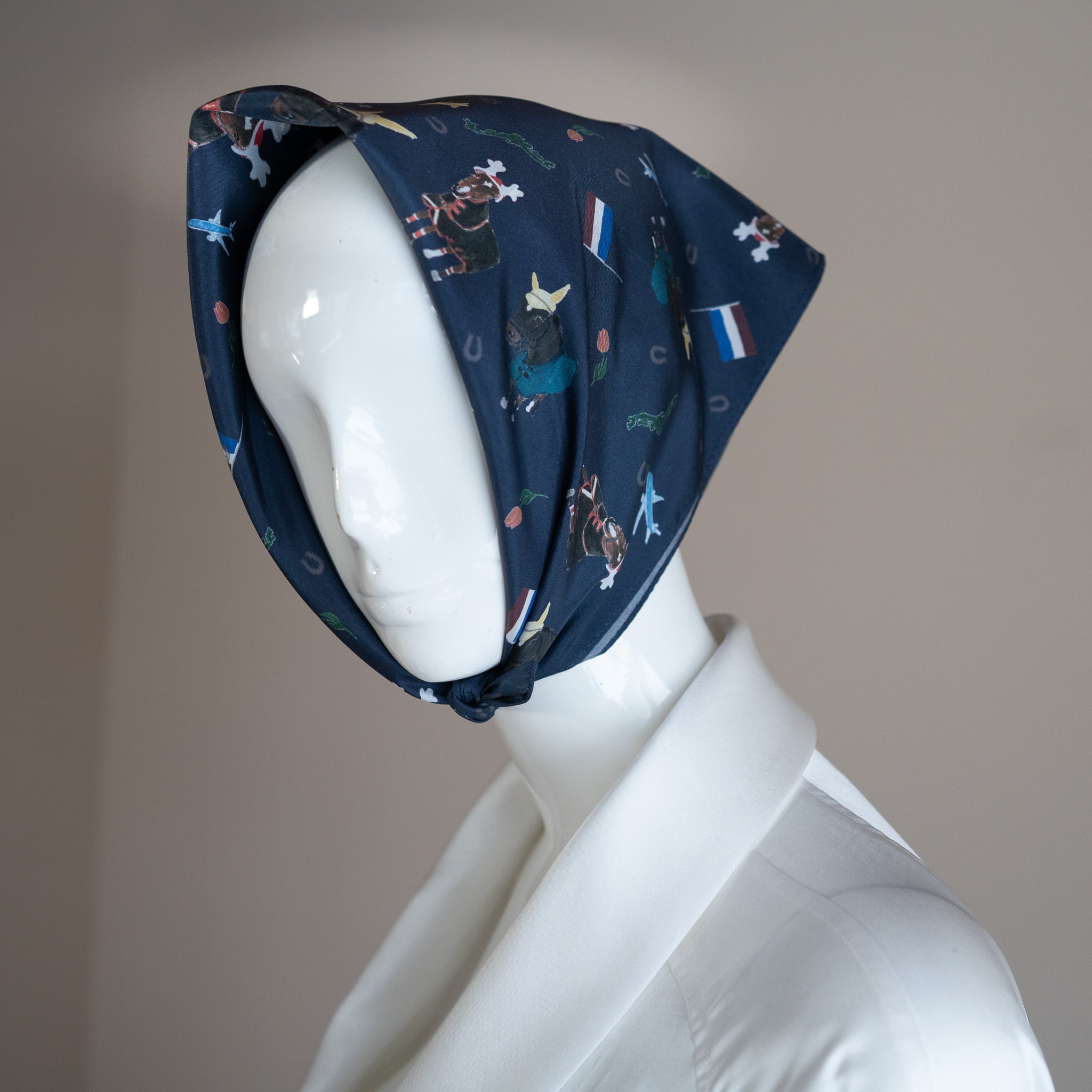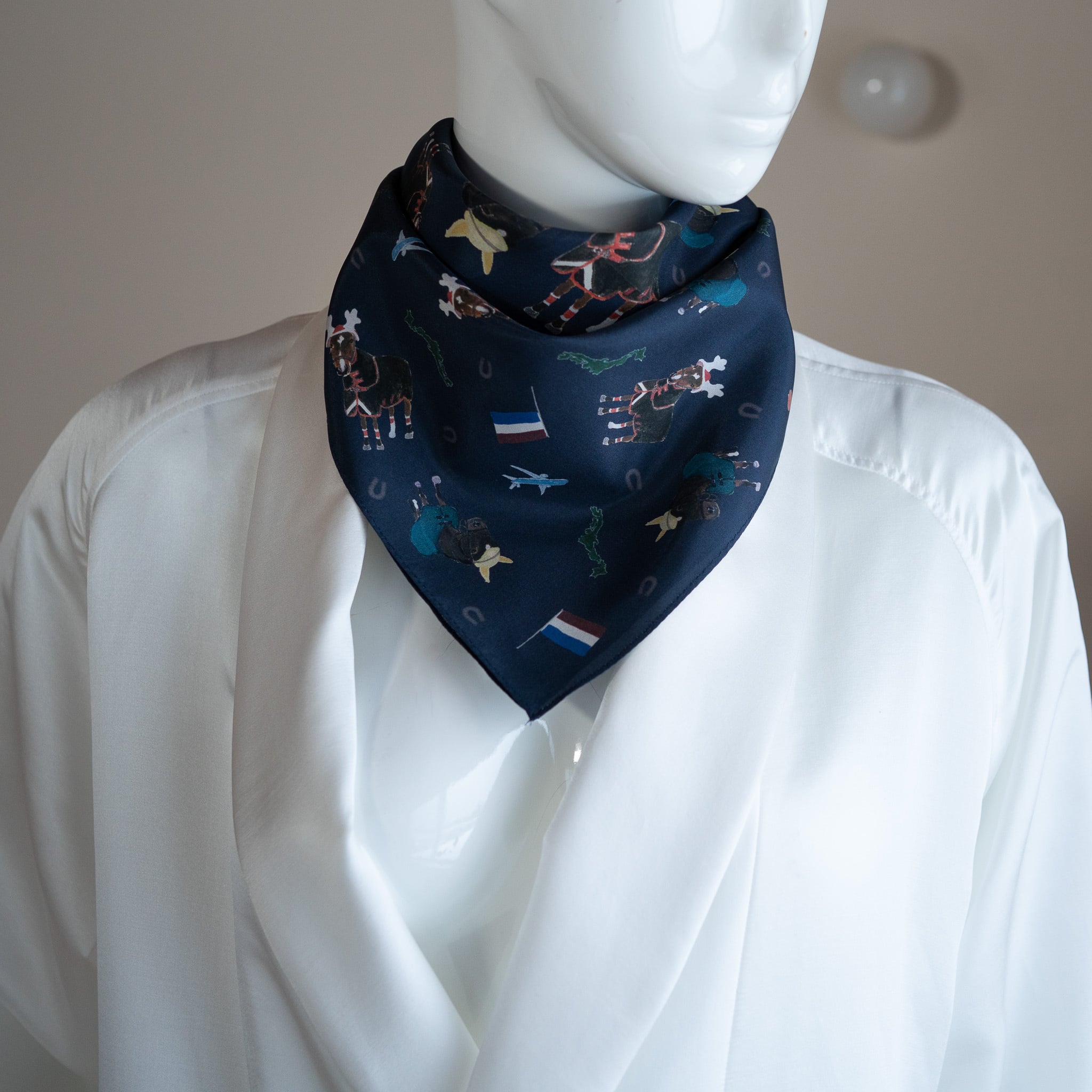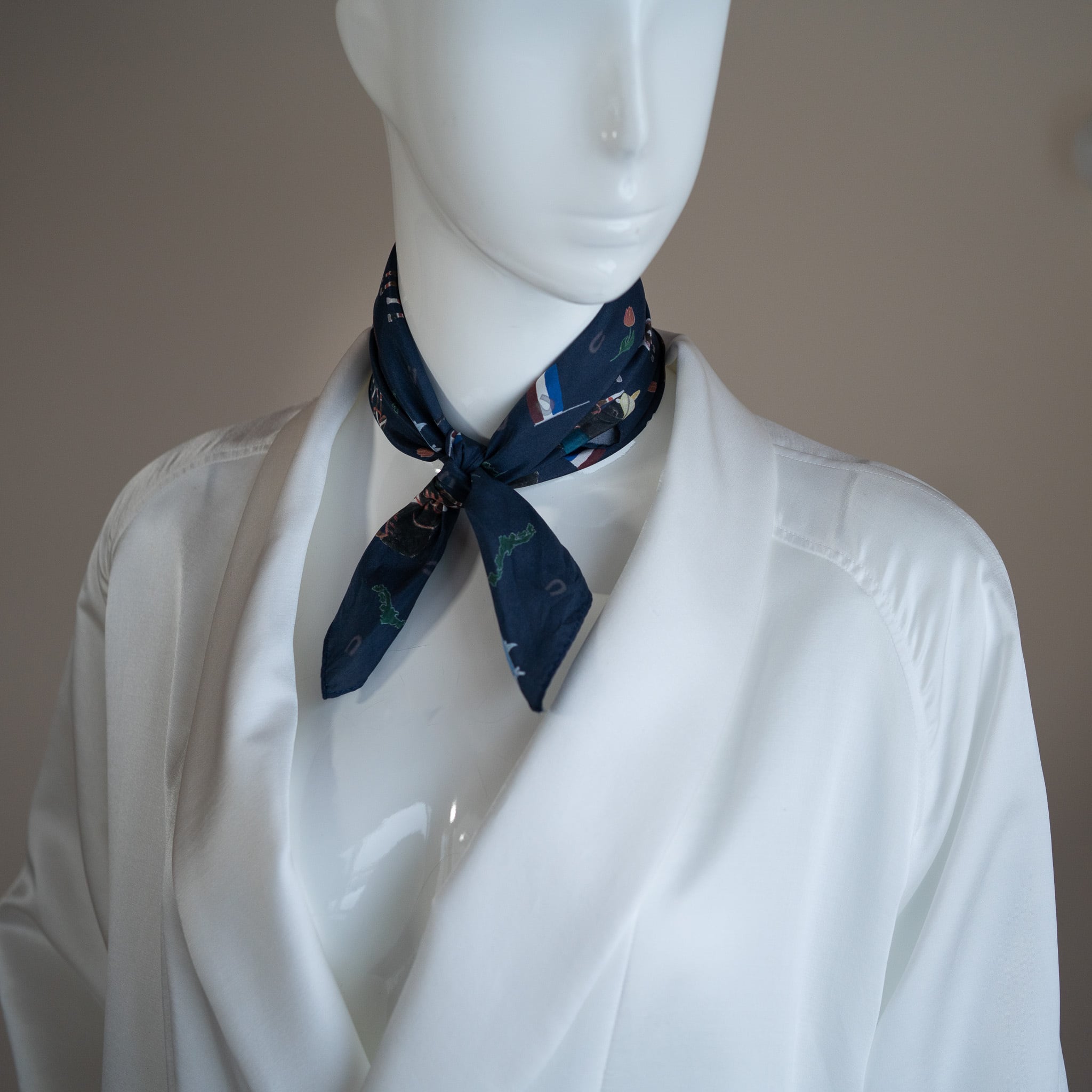 サイズは48cm x 48cmで、首に一巻きして結ぶのでちょうどの長さを設定しております。男性であればポケットチーフとしてもお使いいただけます。バックに忍ばせておいて、さっと首元に華やかさを添えてあげるのもいいのかと思います。