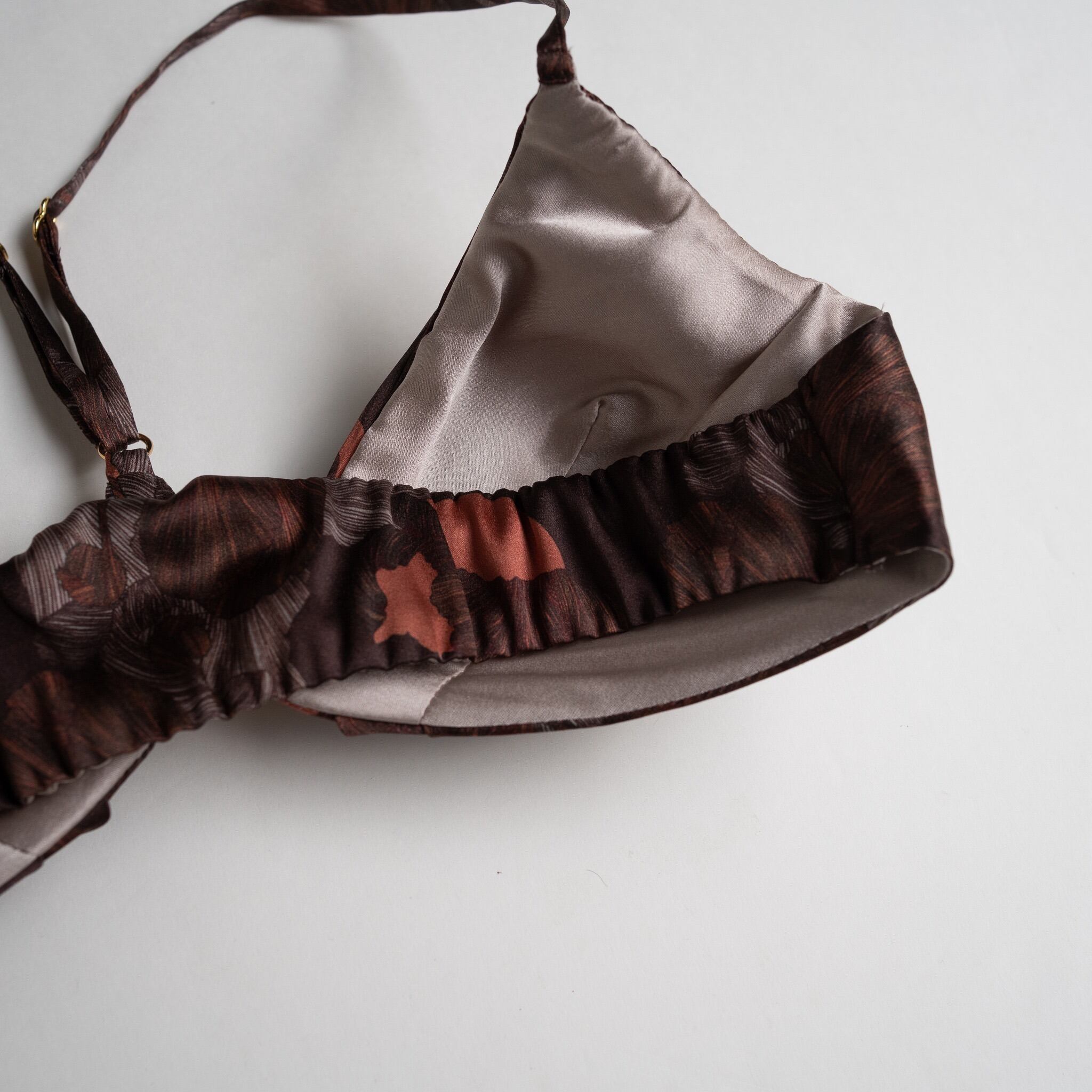 生地自体が強いので、華奢な肩紐でもアジャスターで調整すればしっかりとホールドしてくれます。Vストラップでトライアングルのバッグラインは、肩甲骨を浮き立たせ、背中をヘルシーに綺麗に見せてくれます。手のひらでそっとバストを寄せたようなフィッティングが特徴。
