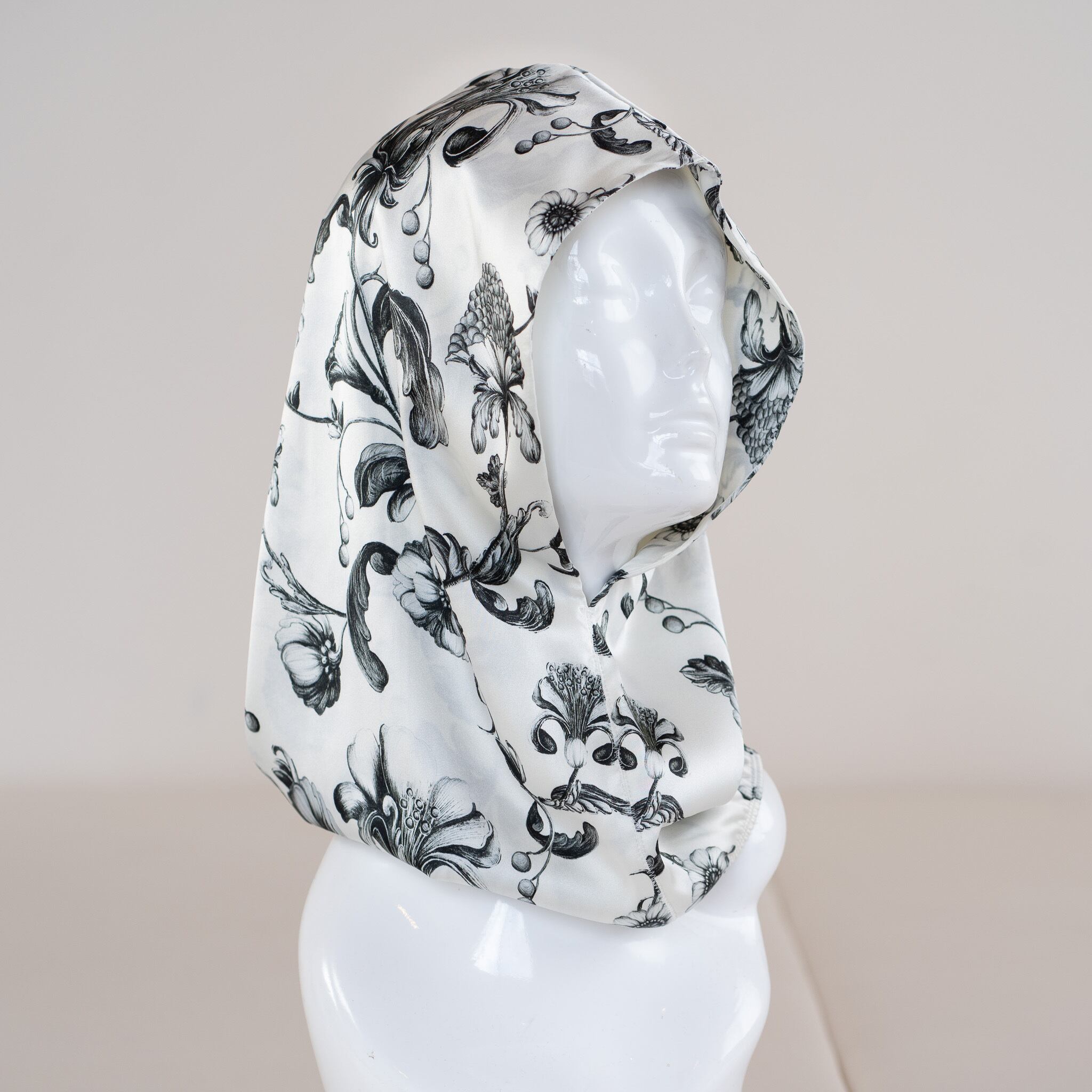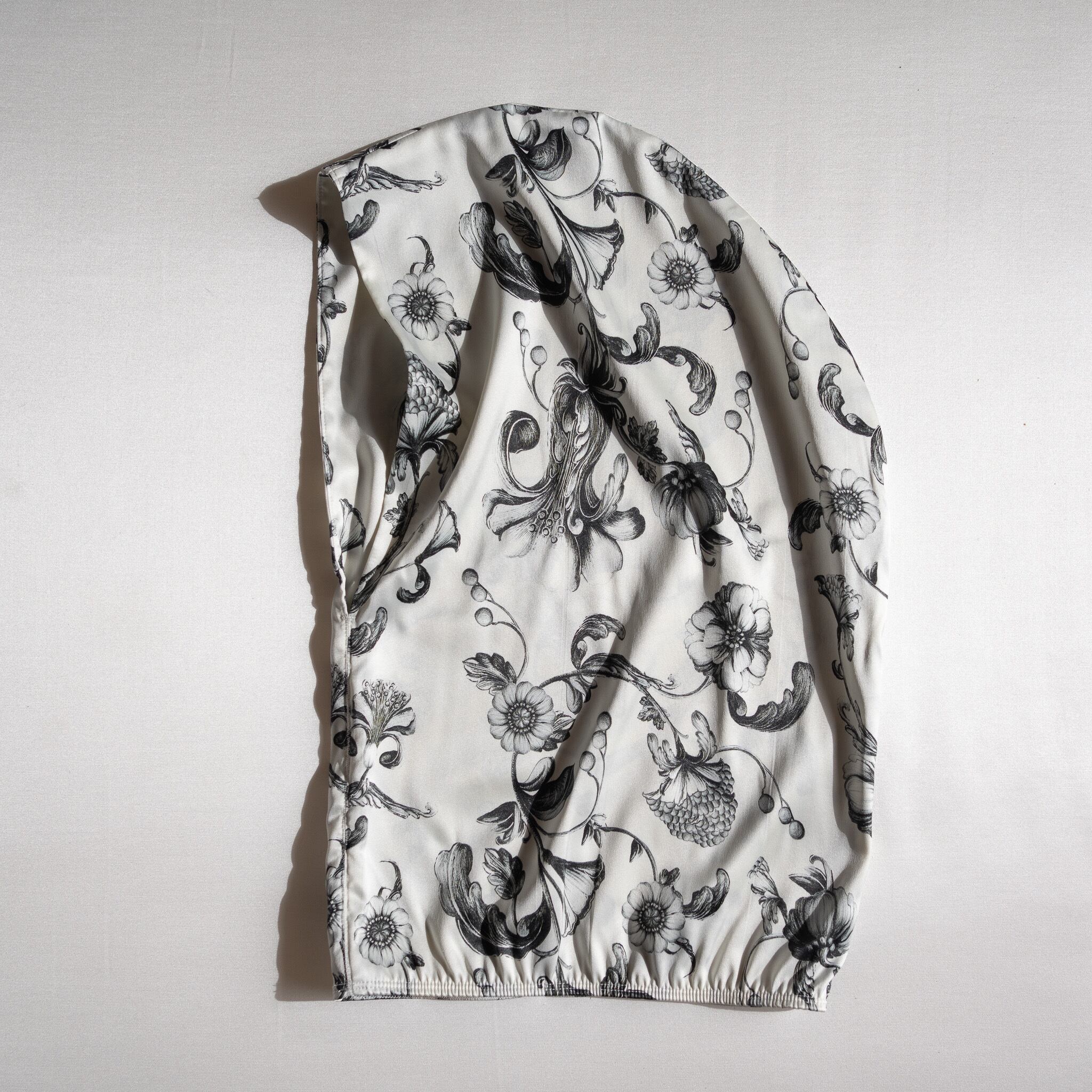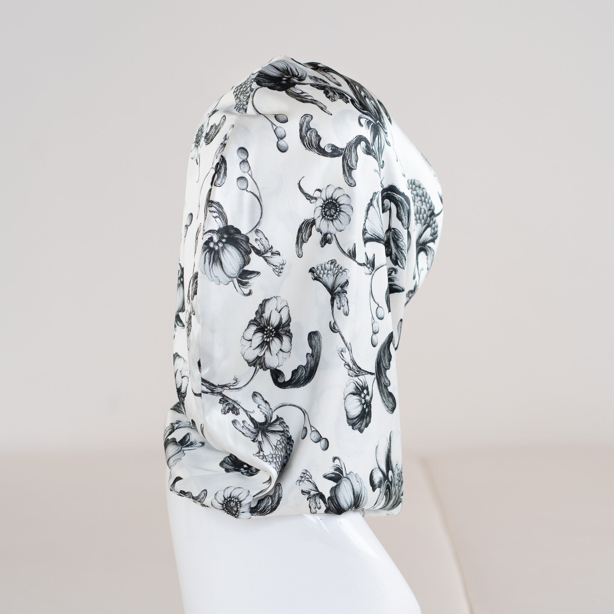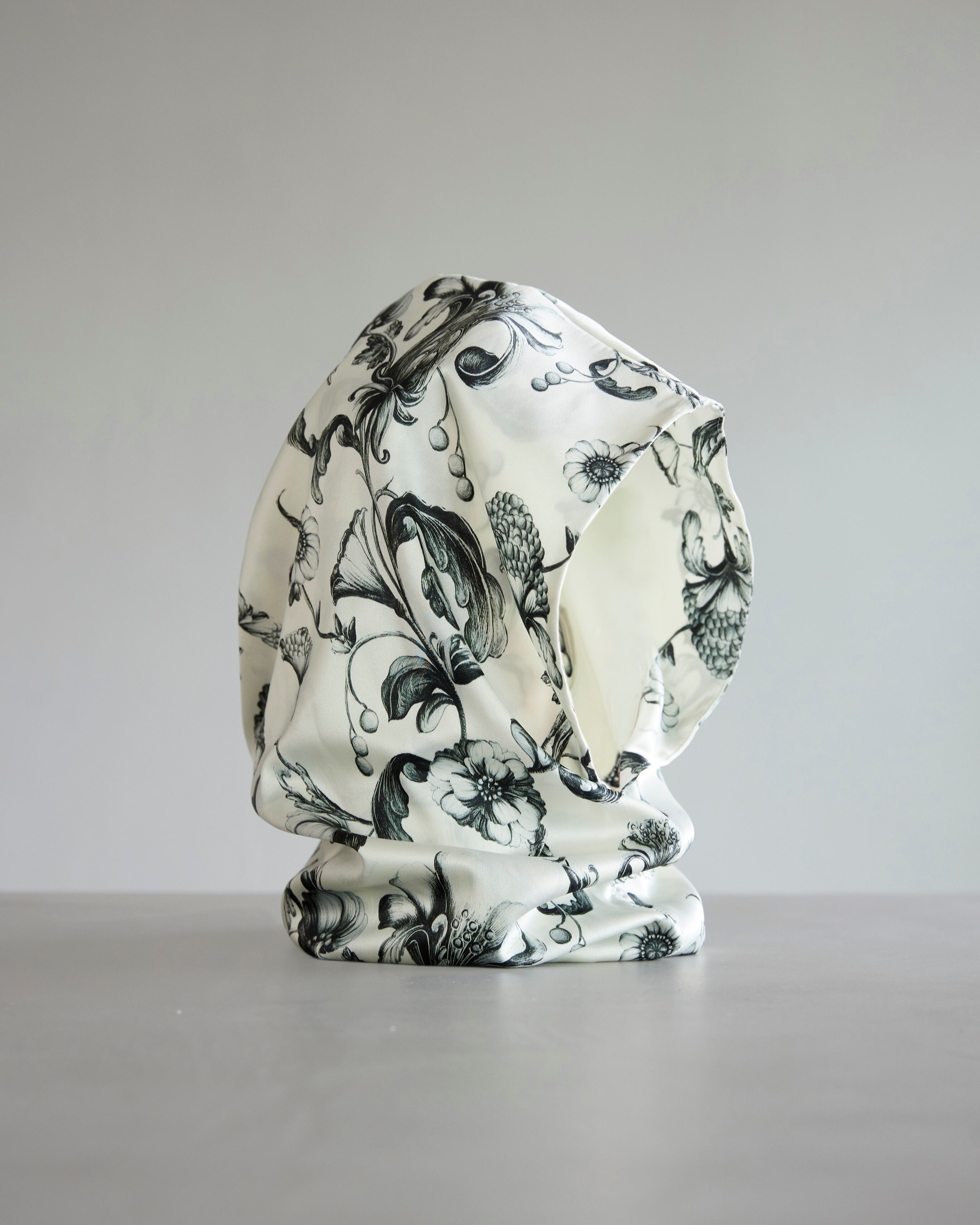 今回、2枚仕立てで表面で縫い合わせた仕様なので、内側で髪の毛のケアをしながら外見は程よい落ちかんのある美しい見た目が特徴です。頭に沿った綺麗なカーブを描くのでお外にそのまま着用していただければ、寒い冬外出時の厳しい乾燥からあなたの髪の毛をお守りします。また、シルクサテン生地の柔らかさと滑らかさが睡眠時間を素敵な時間へと変貌させます。